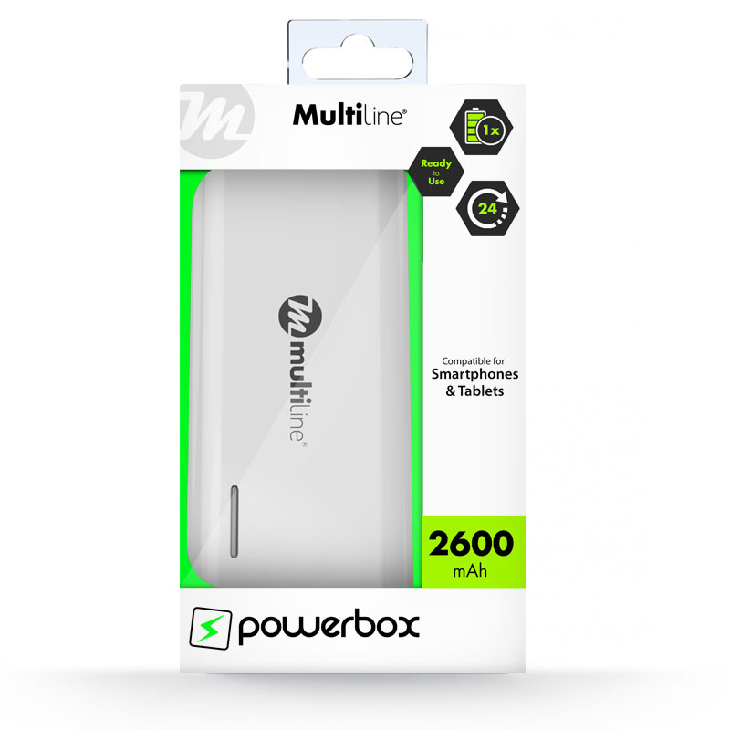 Deze Multiline powerbank met USB poort heeft een output van 5V / 1A met een totale capiciteit van 2600mAh. Dit is voldoende om de meeste smartphones tot 1 keer volledig op te laden!